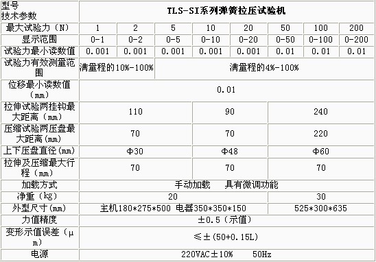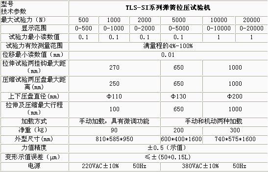 產(chǎn)品概述: TLS-SI系列雙數(shù)顯示拉壓彈簧試驗機采用集成電路、微機技術對位移、試驗力兩參數(shù)進行電子檢測、數(shù)字顯示并對試驗結果進行打印。施加試驗力為手動,還可以對負荷傳感器位移作自動修正。,適用于各種精密拉伸和壓縮螺旋彈簧試驗機及對脆性材料的強度測 功能特點: 數(shù)字顯示位移、負荷,扭轉彈簧試驗機,精確直觀并對試驗結果進行打印 采用ISP技術編程,彈簧試驗機,對負荷傳感器的變形自動修正 試驗力、位移任意點清零,彈簧拉壓力試驗機,可任意設定檢測基準 具有峰值保持、過載保護等功能 技術參數(shù):