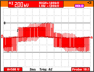 50 Hz馬達(dá)驅(qū)動輸出電壓的脈寬調(diào)制信號的細(xì)節(jié)。1000V,,50 微秒的脈沖即導(dǎo)致某些測試設(shè)備的不穩(wěn)定。