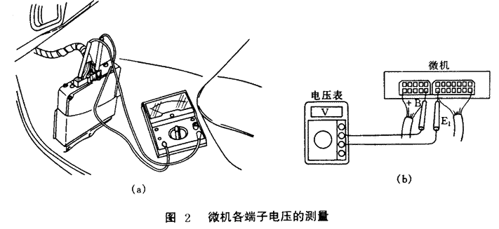 (4)必須在微機(jī)和線束連接器(插頭)處于連接的狀態(tài)下測(cè)量微機(jī)各端子的電壓并且萬(wàn)用表的測(cè)筆應(yīng)從線束插頭的導(dǎo)線一側(cè)插入進(jìn)行測(cè)量微機(jī)各端子的電壓(如圖 2所示)。