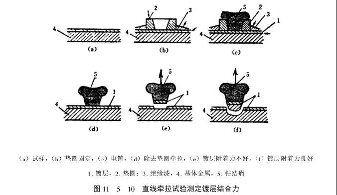 直線章拉試驗(yàn)可直接在鍍件上進(jìn)行。首先在試件鍍層表面,用一非導(dǎo)體墊國固定在被測(cè)部位上,并在墊國以外的鍍層表面加以絕緣層,然后在墊國以內(nèi)的鍍層上電鑄鈷或其它金屬,經(jīng)一定時(shí)間,在該鍍層上沿墊國內(nèi)壁形成一個(gè)金屬結(jié)瘤,電鑄結(jié)束后取下墊國,除去絕緣層,將鑄有金屬結(jié)瘤的試件置于專用的張力測(cè)試機(jī)上,以機(jī)械力將般層牽拉至斷裂見圖11_5_10。根據(jù)般層剝離時(shí)用力的大小及般層結(jié)合面積可計(jì)算出般層的結(jié)合強(qiáng)度。